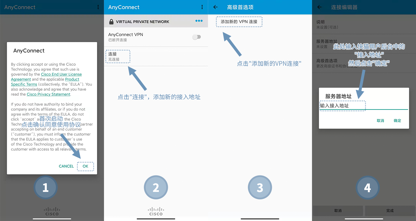 您可以在Anyconnect中新建一个VPN连接,同时将飞狗会员后台中的“接入地址”输入即可。