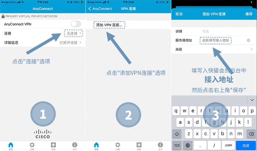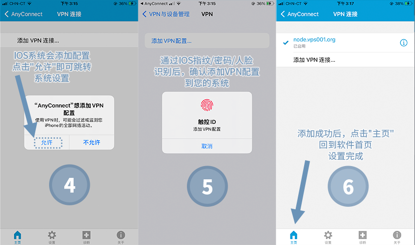 首次配置Anyconnect工具时,需要在系统中添加VPN配置,仅需按照提示逐步即可。