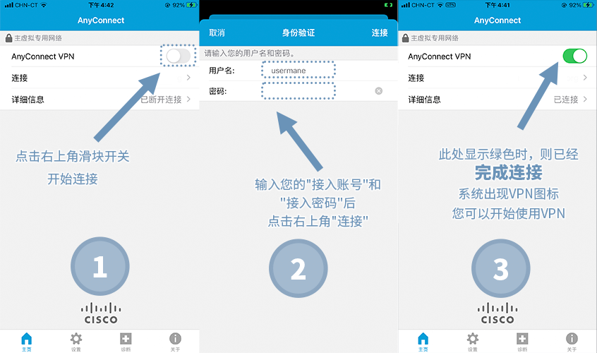 首次连接时,需要您输入接入账号,Anyconnect会记住您的账号,但出于安全,Anyconnect将不会自动记录您的密码。